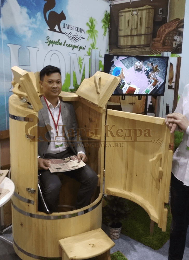 Круглая фитобочка из кедра - это мини парная, которую можно использовать не только в спа-салонах, но и дома. Такая модель наиболее компактна и мобильна. Толщина стенок составляет 40-45 мм, что позволяет увеличить срок службы изделия. Фитобочка оборудована откидными створками, дверцей и отверстием для головы. Верхний скос изделия делает положение головы более комфортным и улучшает обзор. Во время парения человек сидит внутри кедровой бочки, а голова находится снаружи. Благодаря этому исключается возможность перегрева. Подлокотники из кедра, встроенные ручки на створках и двери делают эксплуатацию более удобной.